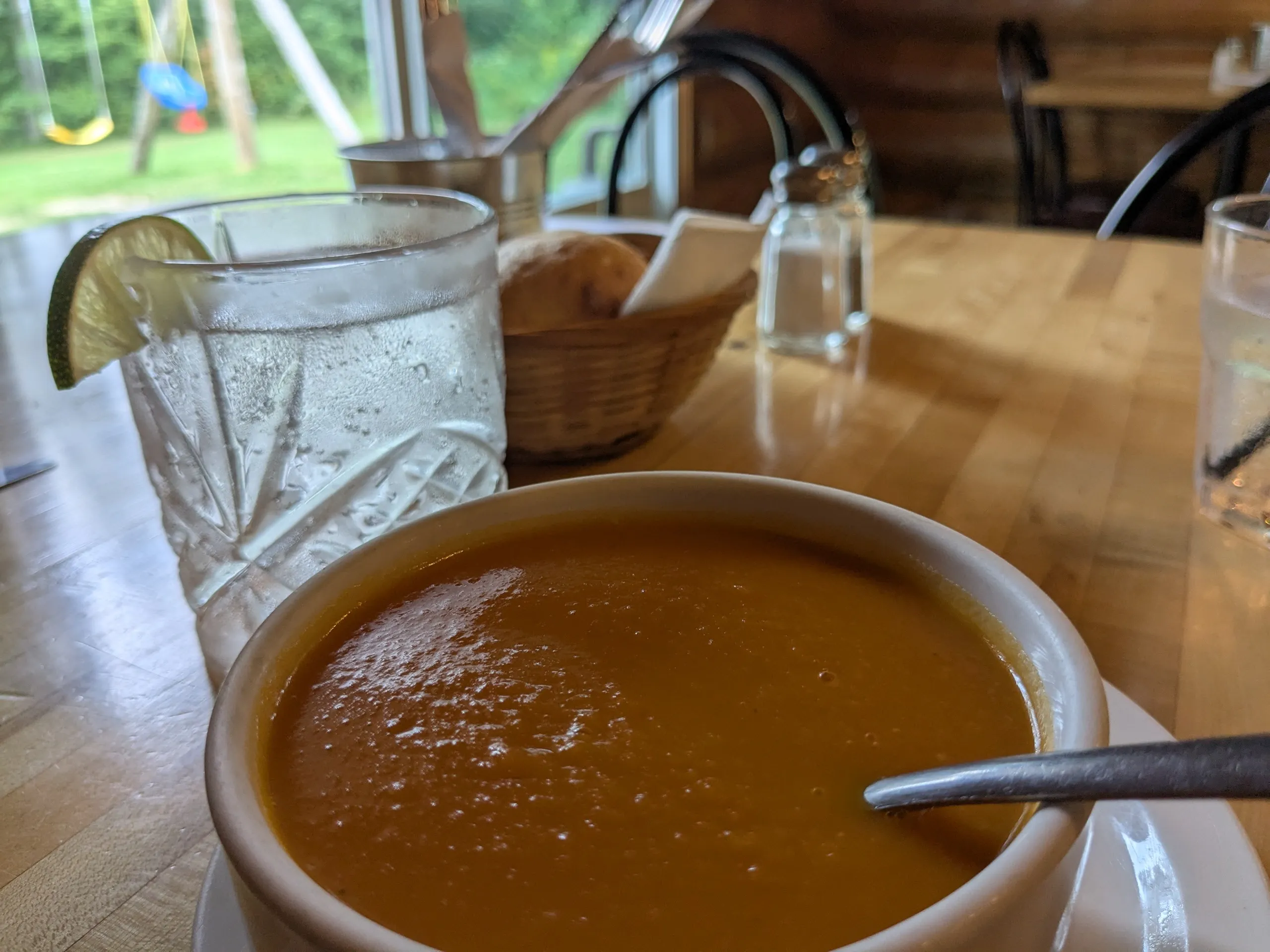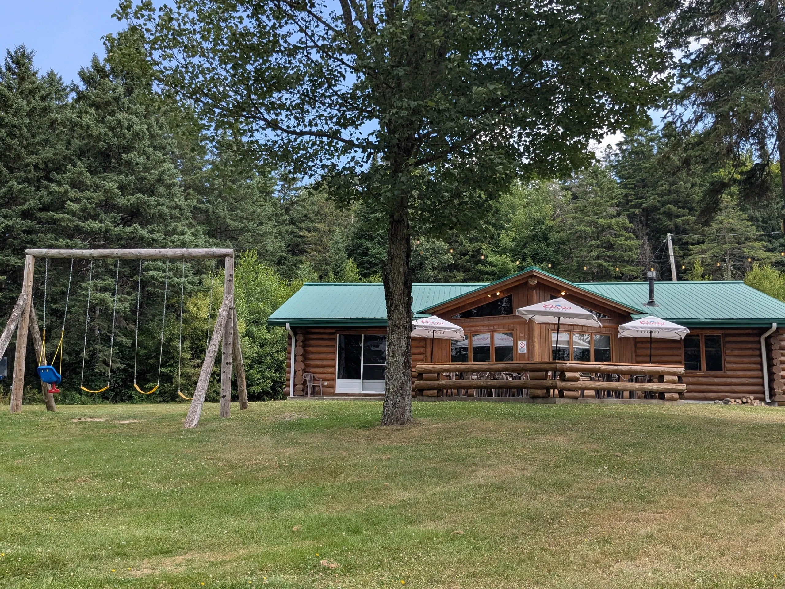 En arrivant, j’ai eu cette impression magique de tomber sur une cachette en bois rond au charme champêtre, avec ses grandes poutres, ses fenêtres qui laissent entrer la lumière et cette odeur réconfortante de cuisine maison. La nouvelle administration a su garder l’âme du lieu tout en y injectant une belle dose de fraîcheur et de convivialité. Dehors, un module de balançoires attend les enfants, bien pratique pendant que les grands s’attardent à feuilleter le menu.