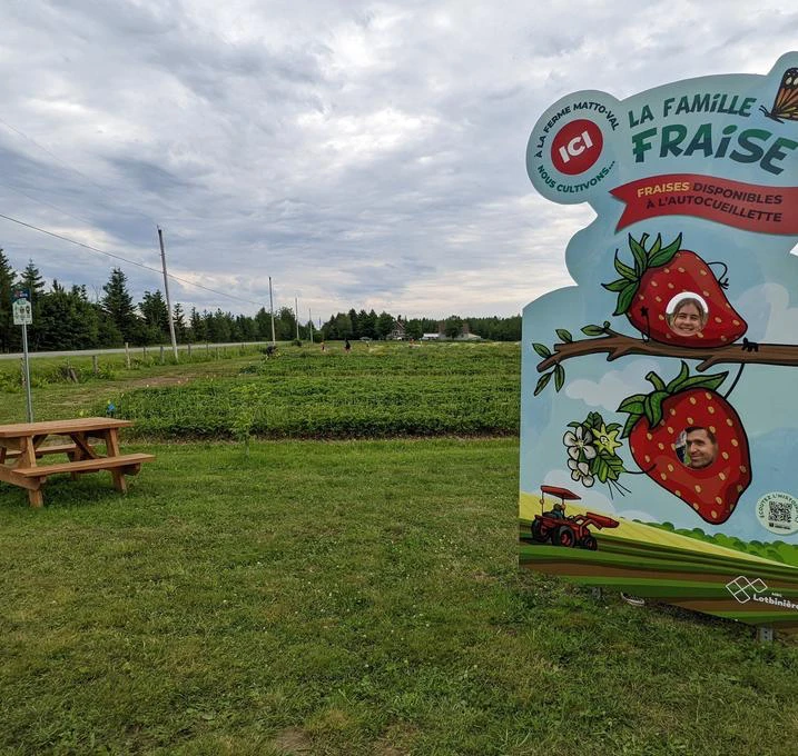 Direction la Ferme Matto-Val à Val-Alain ! L’endroit est facilement accessible grâce à sa proximité avec la bretelle d’accès de l’autoroute 20. De plus, plusieurs panneaux indicateurs ont été installés pour guider les visiteurs dès leur arrivée. Avant même d’atteindre le stationnement, on aperçoit le kiosque, niché près du champ de fraisiers, un petit bâtiment à échelle humaine, construit par des gens chaleureux et accueillants.