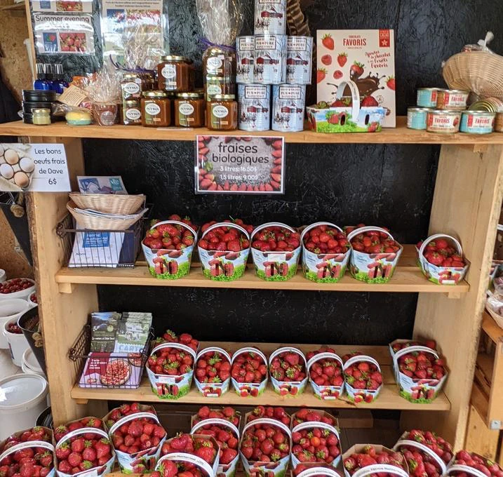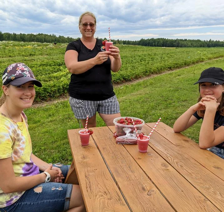 En dégustant notre slush, Dany et Julie, les propriétaires, viennent échanger avec nous. Ils nous expliquent un peu plus sur le savoir-faire derrière la culture des fraises biologiques. Chaque semaine, un agronome se rend à la ferme pour échantillonner les cultures et aider à maximiser le rendement. Des abris pour insectes sont installés dans les champs pour protéger les fraisiers grâce à leurs « super-héros » minuscules. De plus, chaque fraisier a une durée de vie maximale de 2 ans, ce qui oblige les propriétaires à pratiquer la rotation des parcelles.