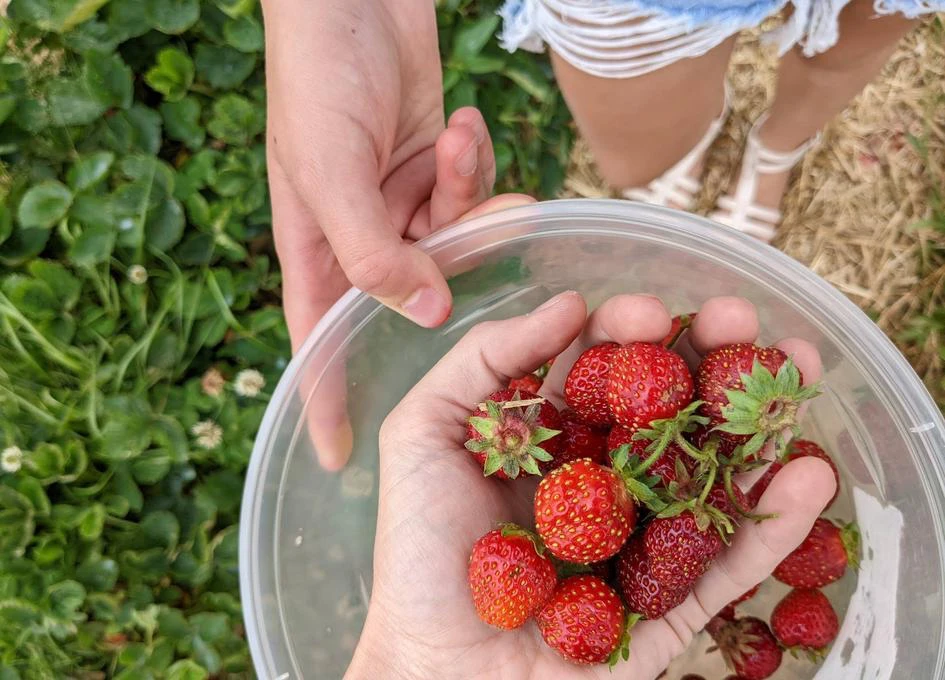 Les propriétaires, chaleureux et accueillants, nous font sentir chez nous, comme en famille. En entrant dans le bâtiment, les effluves de fraises fraîchement cueillies nous envahissent et nous donnent instantanément envie de dévorer un casseau entier ! Mais non, nous résistons à la tentation pour profiter pleinement de l’expérience et cueillir nos propres fraises.