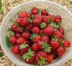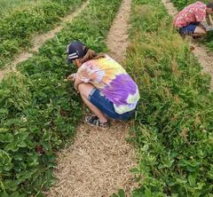 On nous annonce que 13 variétés de fraises sont disponibles à l’autocueillette, et que deux d’entre elles, la Veestar et la Wendy, sont prêtes à être cueillies. Bien que je sois familière avec la Wendy, je me laisse tenter par la Veestar, une petite fraise des champs, plus sucrée et idéale pour mes papilles. Nous pesons notre plat et nous dirigeons vers les champs.