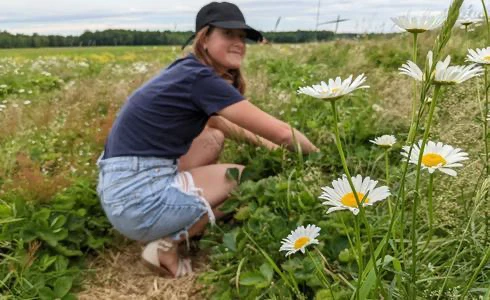 Dès que nous arrivons, la différence entre un champ cultivé de manière biologique et conventionnelle saute aux yeux. Des fraisiers en abondance, parsemés de fleurs sauvages aux couleurs mauves, blanches et jaunes, créent un tableau naturel et superbe. Nous partons à la recherche de nos « bonbons » fruités, et la récolte est rapide et généreuse !